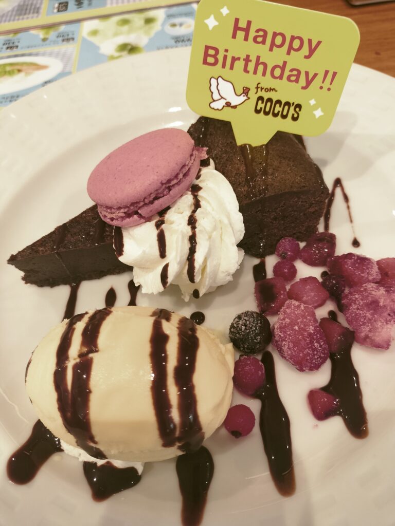 続いて、以前よく利用していた④ココスさんです。ここは包みハンバーグが美味しくて、ハンバーグを食べたくなったらよく利用させて頂いていました。此処のバースデイクーポンもデザートプレートでした。但しここは、きちんとしたとデザートプレートを用意してあり、手間をかけていました。プレートの内容も納得するものですが、唯一残念なことが、サービスがネコポスと言う配膳ロボットが機能しているので、当然デザートプレートもネコポス君がもってきてくれました。味気ないですね。バースデーデザートだけでも人がサービスして、一声かけてくれると嬉しいんですけどね。